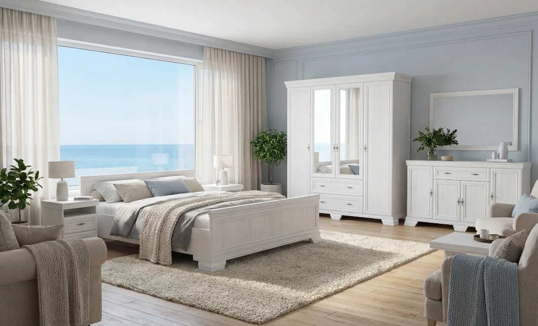 Amenajarea unui dormitor în tonuri deschise, inspirată din stilul clasic reinterpretat, rămâne una dintre cele mai sigure alegeri pentru un spațiu relaxant, aerisit și atemporal. În această configurație este utilizat mobilier din setul de dormitor KoraAndersen, compus din pat, noptiere, dulap și comodă, elemente care definesc armonia vizuală și funcțională a întregului spațiu.